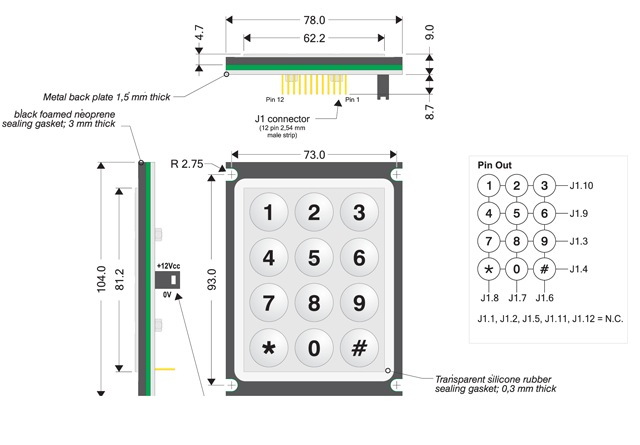 Vandalismusgeschützter Ziffernblock/Pinpad mit 12 Tasten, Schutzklasse DIN IP 65 frontseitig