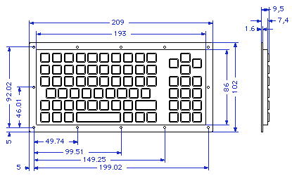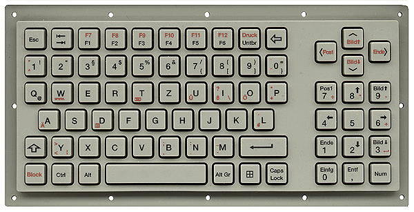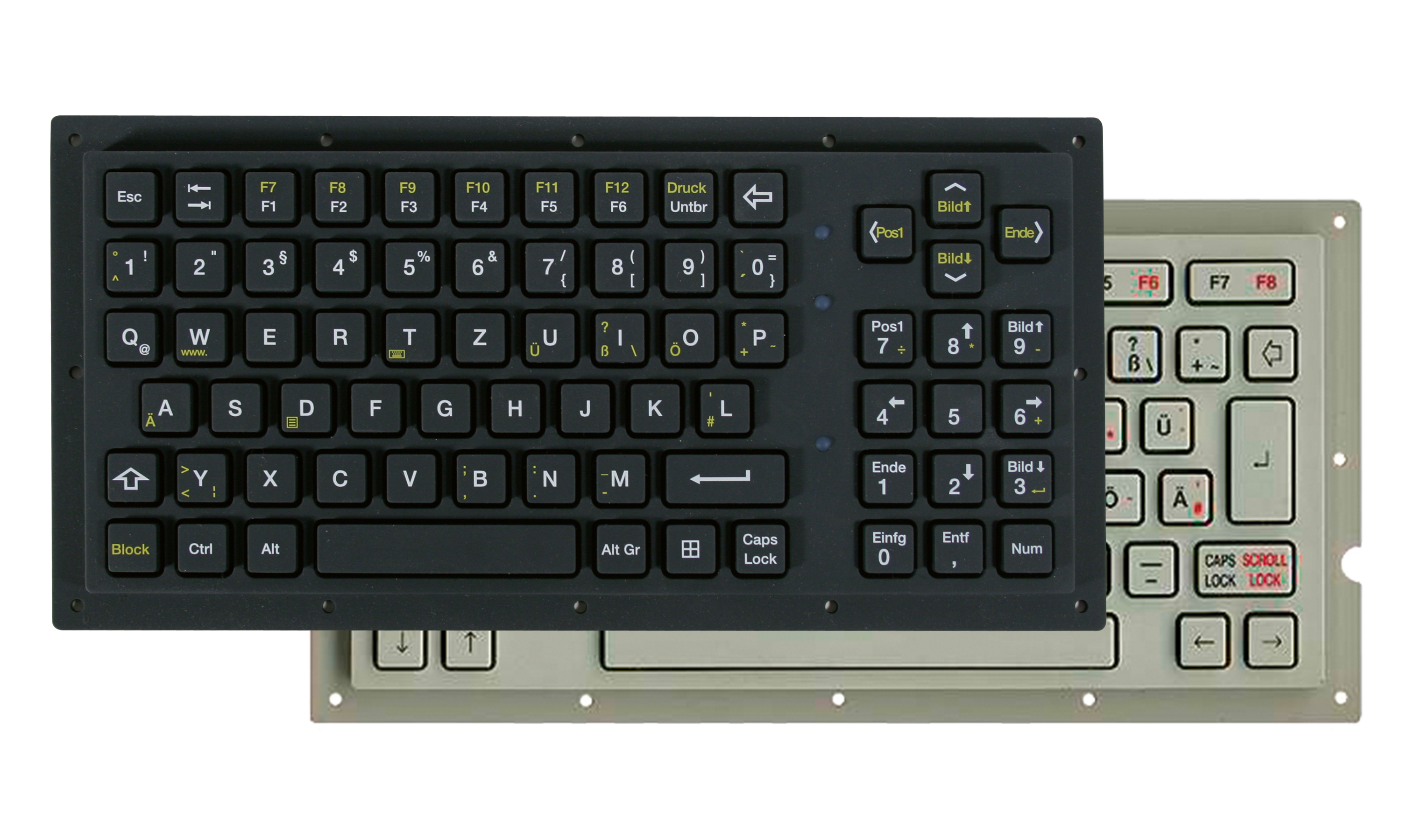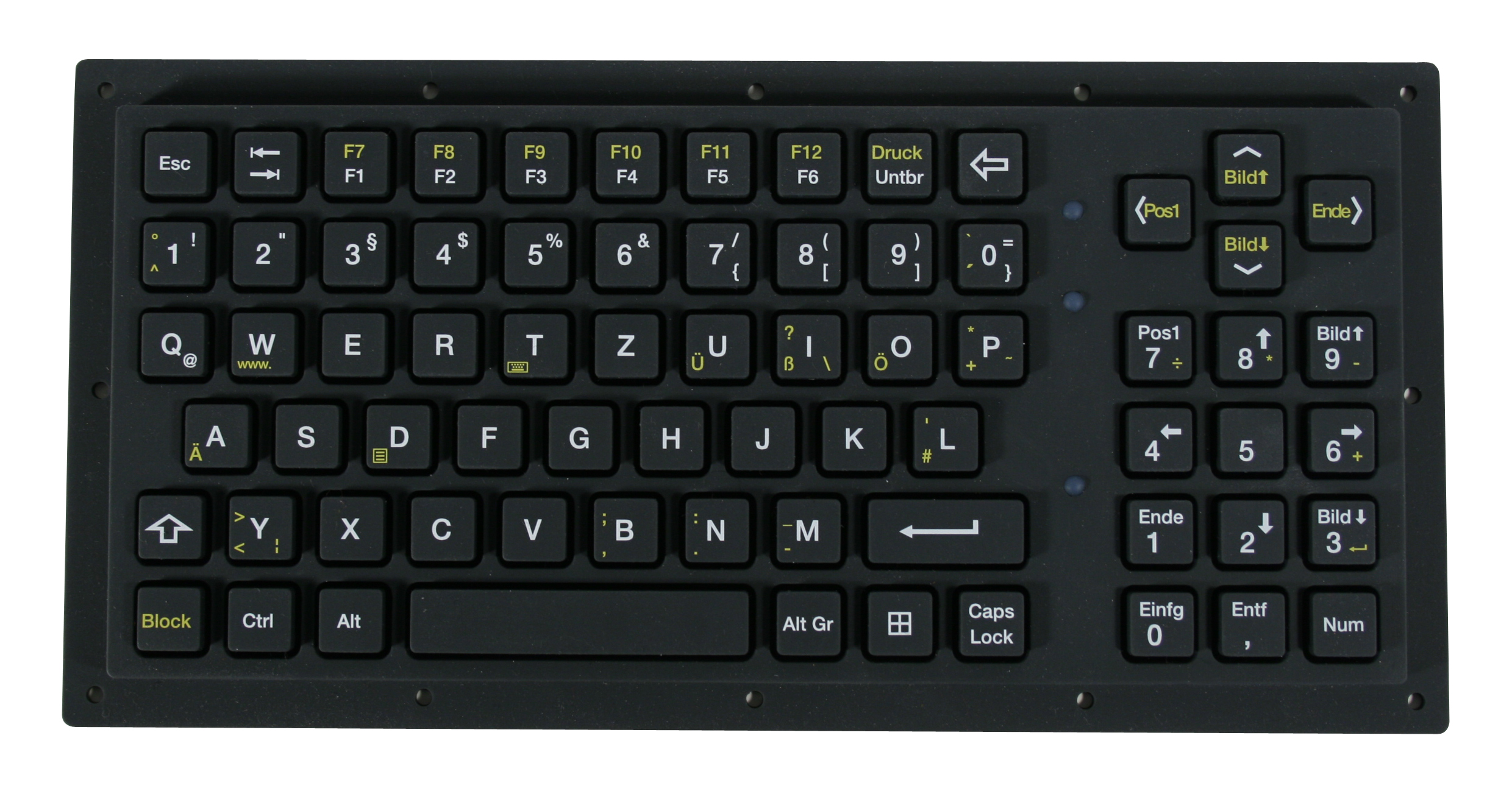 | Die Silikonschaltmatte der Serie GTG-71 hat ein alphanumerisches Layout mit 71 Tasten, angelehnt an eine Standard-PC-Tastatur. Abgetrennt vom Haupt-Tastenfeld sind separat ein Nummernblock und die Cursorsteuertasten angeordnet. Dabei ist die Tastaturmatte sehr kompakt. Durch die hochwertigen Kontaktpillen ist die Tastatur sehr zuverlässig im industriellen Einsatz. Die Tastenmatte kann kundenspezifisch bedruckt und sogar im Layout verändert werden. | |