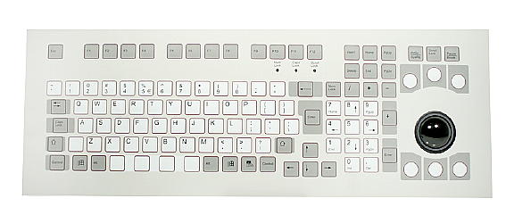 Folienabgedeckte Kurzhubtastatur mit Trackball oder Touchpad, frontseitig wasserdicht, in verschiedenen Layouts.