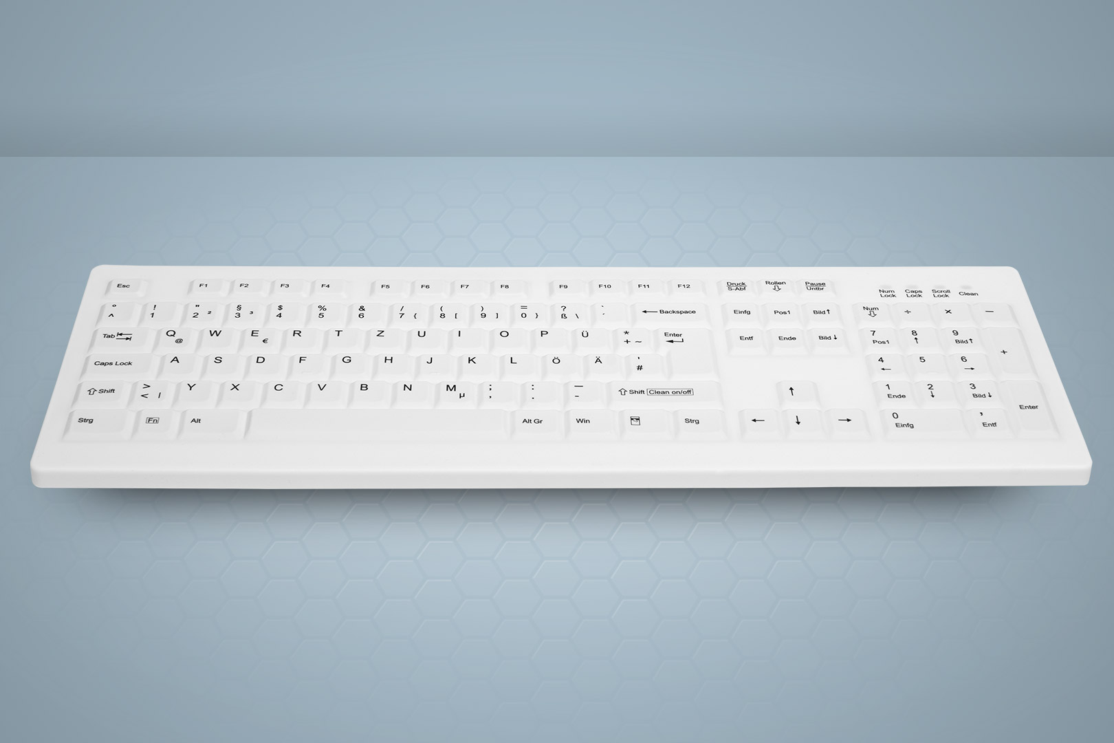 | Aufgrund ihrer Reinigungs- und Desinfektionsfähigkeit ist sie besonders für den Einsatz in Krankenhäusern, Arztpraxen und hygienekritischen Umgebungen geeignet. Sorgfältige Flächendesinfektion des Tastenfelds durch Wischdesinfektion der nahtlosen, flachen Silikontastenmembran ohne Ecken und Kanten. | |
