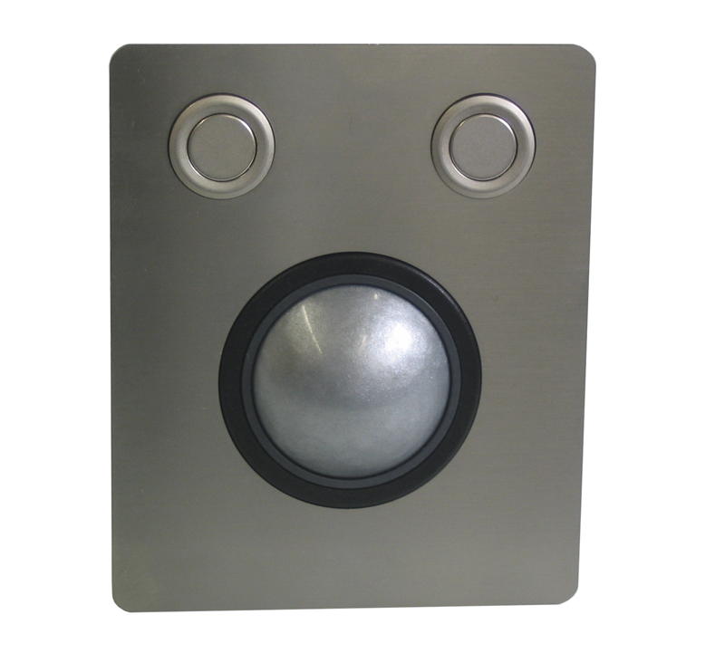Ergonomischer PC Laser Trackball mit zwei Maustasten für Industrie in Edelstahl Platte, vandalensicher, IP68.