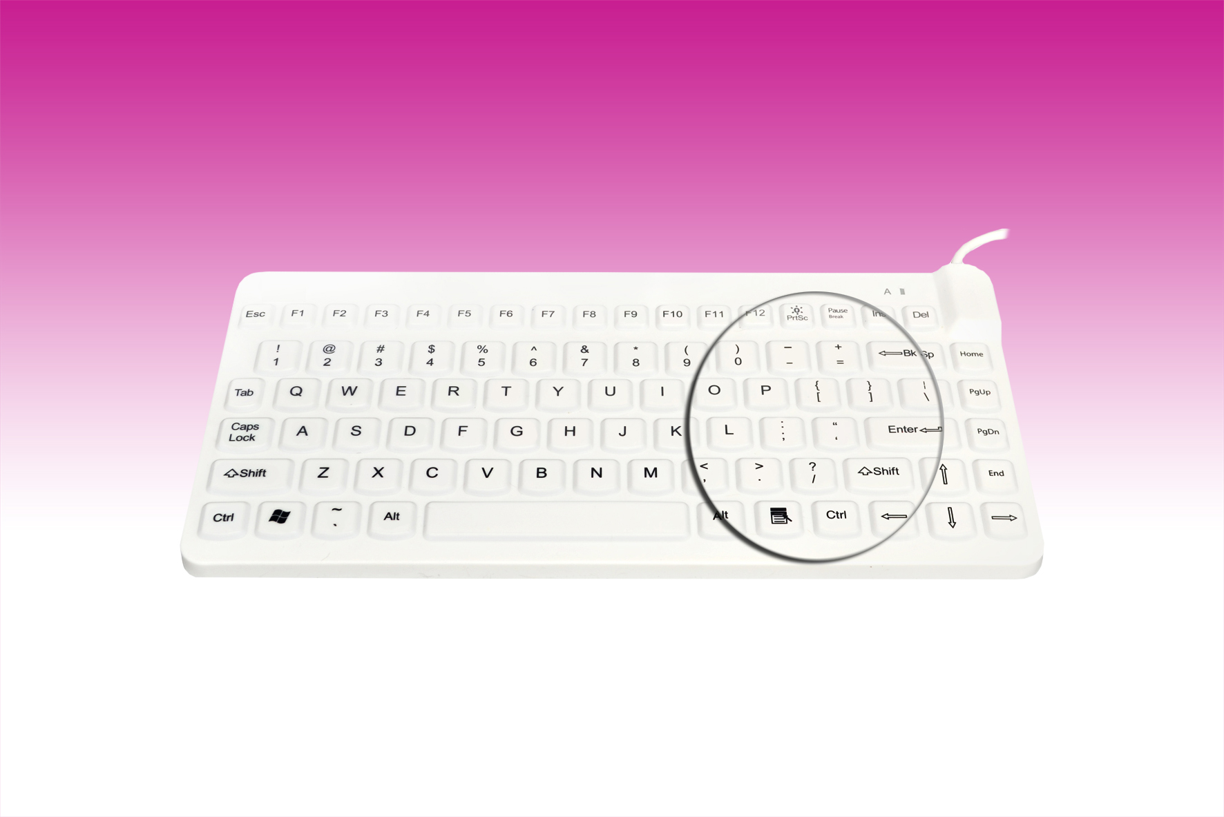 | Deshalb ist eine reine, saubere und kontrollierte Umgebung in vielen Elektronik- und Automobilfertigungen unverzichtbar. Die „Slim Cool LP“ (= low profile) ist eine kompakte silikonummantelte Tastatur. Alle 80 Tasten sind zertifiziert nach DIN IP68. Der Schutzgrad garantiert eine hohe Qualitätssicherung in anspruchsvollen Fertigungsumgebungen. In deutschem oder US-amerikanischem Layout lieferbar und mit USB-Anschluss erhältlich. | |