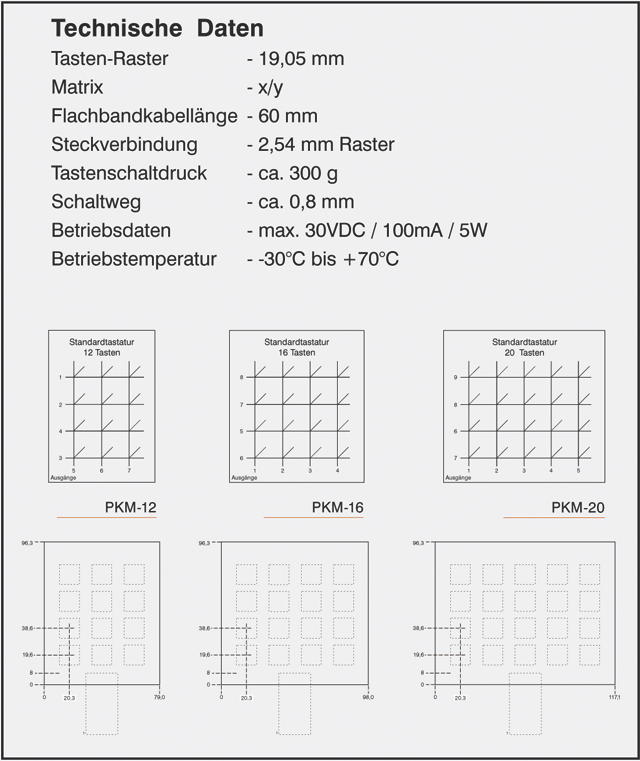 | Abmaße: PKM-1608 Abmaße: PKM-1612 Abmaße: PKM-1616 Abmaße: PKM-1620 | 47 x 82 x 1 mm 79 x 96,3 x 1 mm 98 x 96,3 x1 mm 117,1 x 96,3 x 1mm |