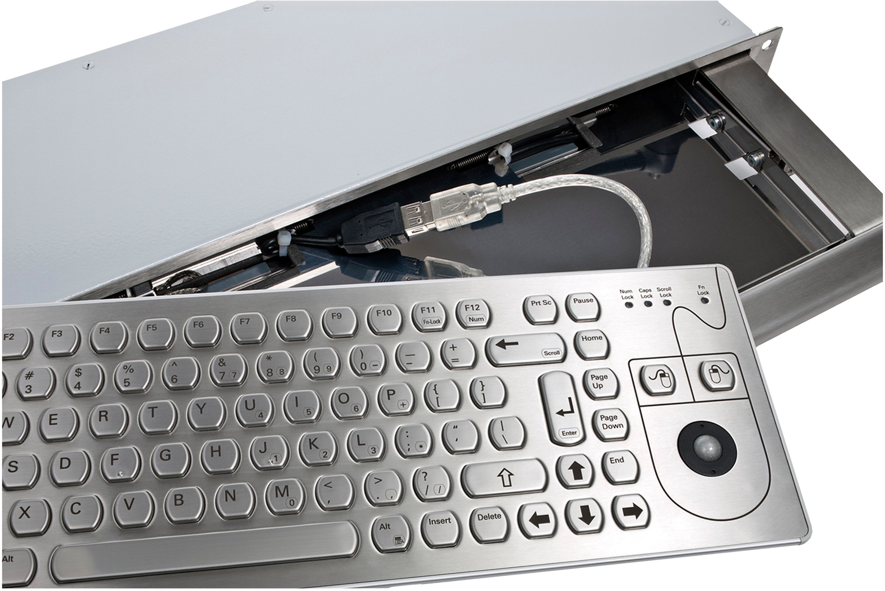 Industriekonforme 1 HE Schublade mit Edelstahl-Blende und integrierter KVS-91 Metall-Tastatur