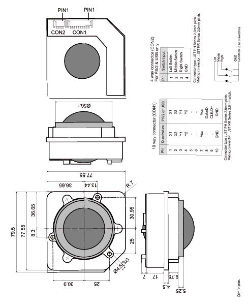 | Von oben gesehen: Befindet sich die 10-pol. Anschlussbuchse links (wie im folgenden Technikbild dargestellt - 9 Uhr Position), dann sind die Dip-Schalter entsprechend obiger Tabelle einzustellen. Im Beispiel: USB-Version: Dip-1 und -2 auf EIN. Soll der Trackball so eingebaut werden, dass die 10-pol. Anschlußbuchse oben liegt (12 Uhr), so ist Dip 1 auf Ein und Dip 2 auf Aus einzustellen usw. | |||||||||||||||||||||||||||||