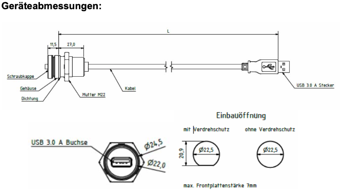 | Verbinden Sie die Einbaubuchse per USB Stecker direkt mit der Arbeitseinheit und montieren Sie die Anschlussbuchse in Ihrem Tisch, der Frontplatte oder ähnlichem. | |