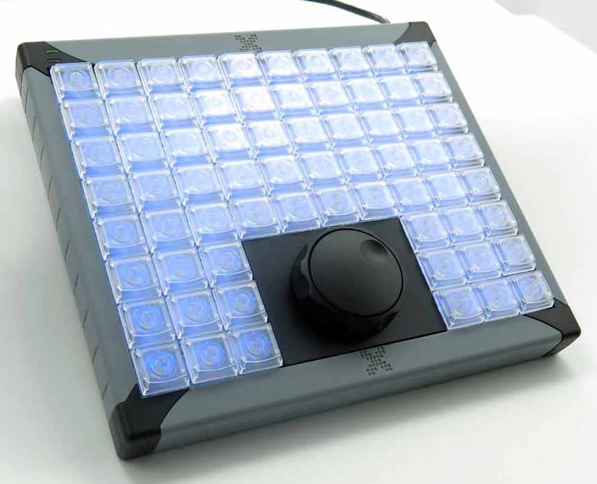| Die Tastatur ist völlig frei programmierbar. Der Kunde kann frei über die Belegung der 68 Tasten und über deren Farbe und Zusammenfassung entscheiden. | |