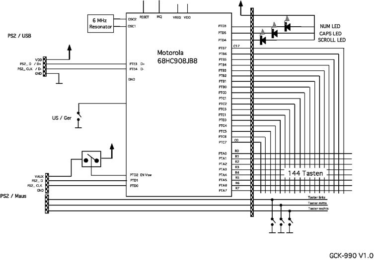 | Der Tastaturcontroller GCK-990 verfügt über einen USB/PS/2 Autodetect Combo Port, d.h. er verfügt über die automatische Erkennung der Schnittstelle bei Einstecken des Kabels. Er unterstützt USB Sleep Modes und hat einen Standard Tastatur- und Maustreiber integriert. | |